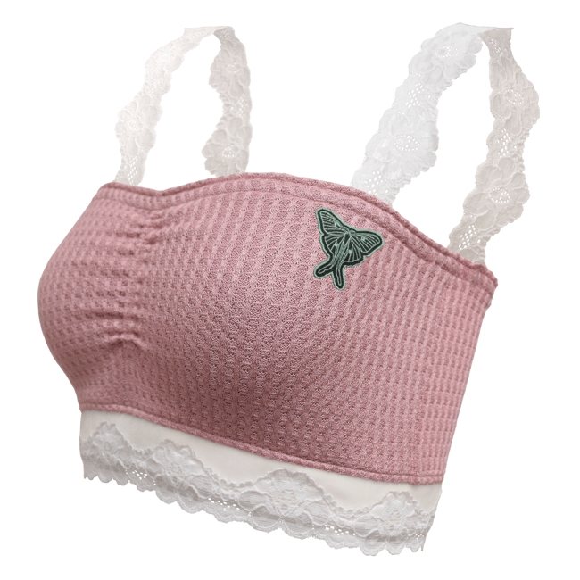 The outer layer of this luxurious bandeau top is made of a soft textured waffle knit, lined with buttery rayon jersey. A thin elastic band with clear rubber grip is sewn to the upper edge of the lining to secure the top in place. The supportive underbust band is made of elastic velvet, and stretchy off-white scalloped lace is used as both trimming and shoulder straps. Another small strip of elastic is set in between the layers of fabric at center front to help shape and add separation.