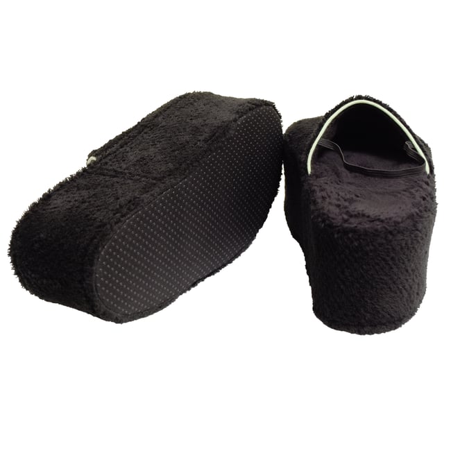 These slippers are made with soft, fuzzy fleece covers and lightweight cross linked polyethylene foam in the soles. The elastic ankle straps help the shoes stay in place when worn and make the sizing more flexible. Sole height is 3". The bottoms of the soles are covered in rubber grip dots for stability.